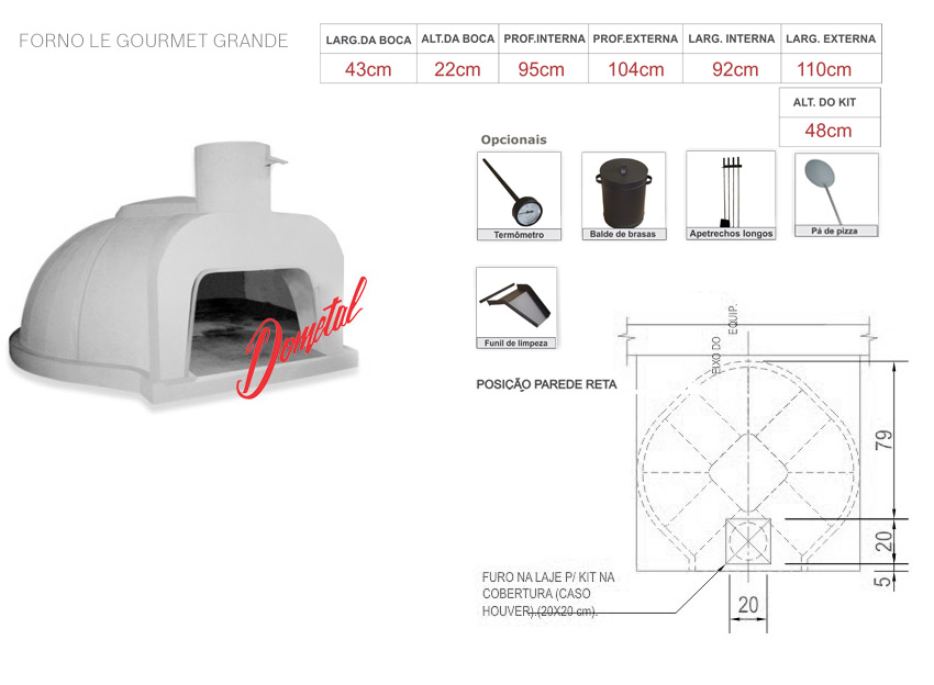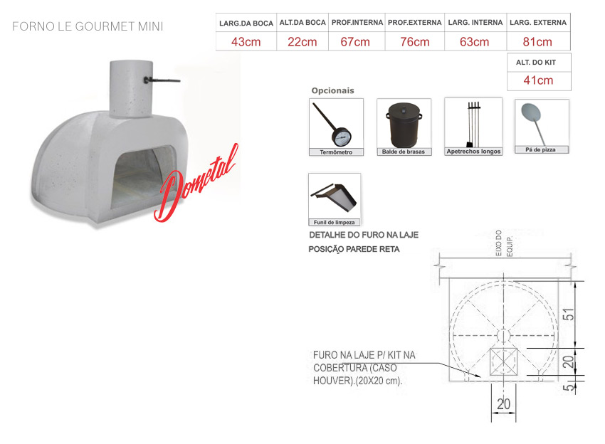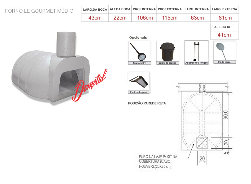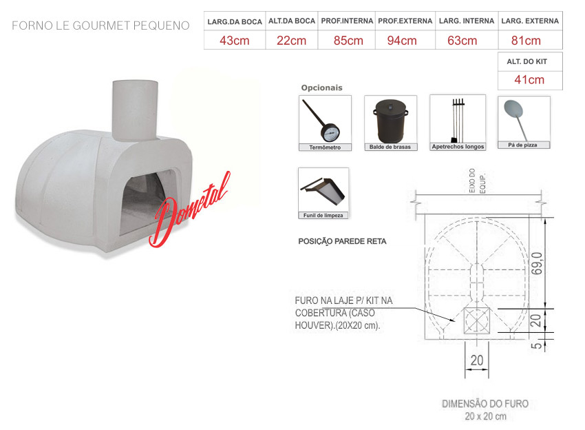 Trata-se de um forno muito mais compacto do que aqueles comumente encontrados no mercado, apresentando muito mais rendimento térmico, menor consumo de lenha, (4 a 6 Kg por uso), sem perder a capacidade necessária que uma família precisa para apreciar este tipo de arte culinária. E o mais importante: Cabe em qualquer cantinho graças às suas dimensões reduzidas e ergonômicas.