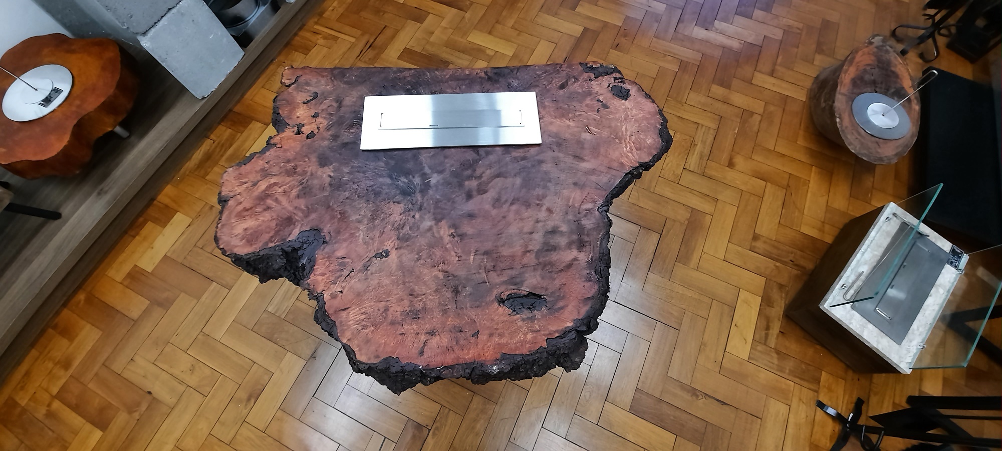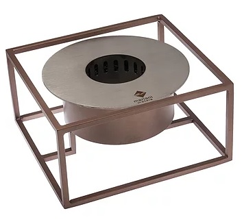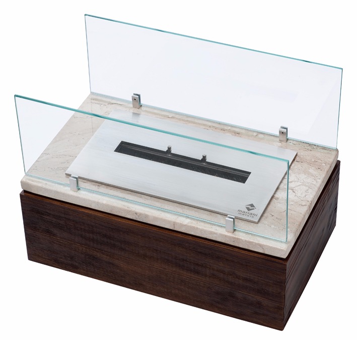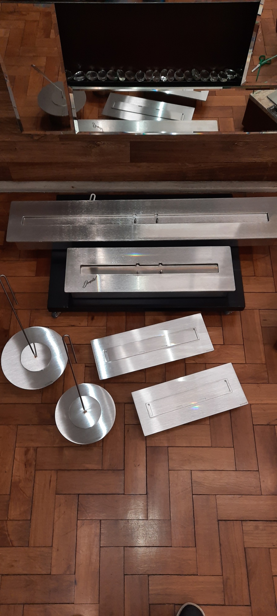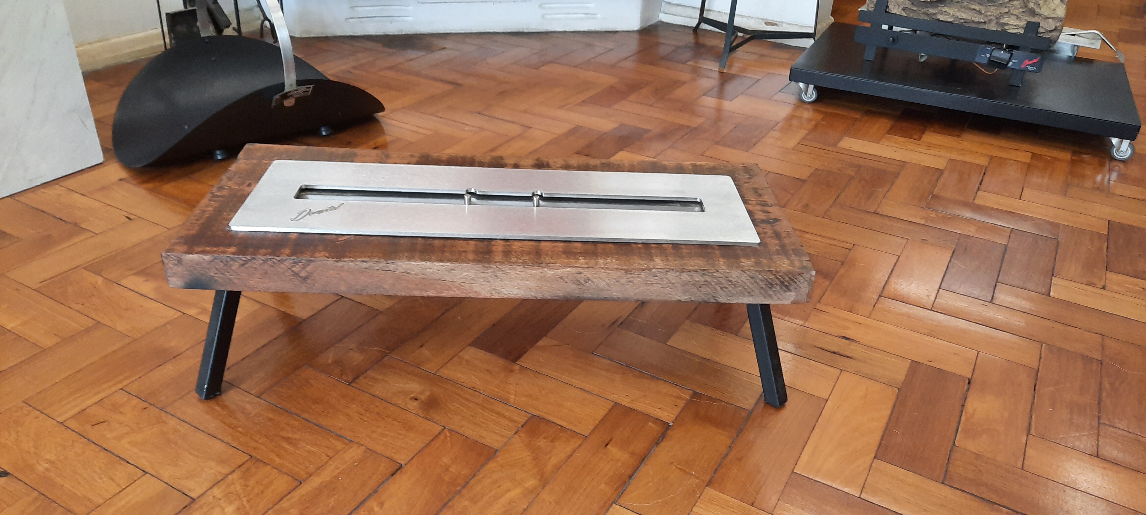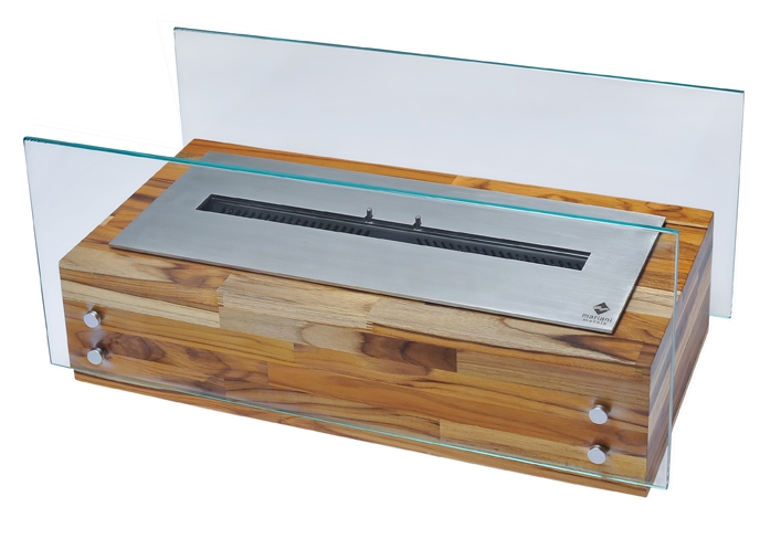 Este modelo usa o QUEIMADOR  LOW 1060 de aço inox e seu revestimento utiliza chapa de madeira TECA (é uma madeira nobre, utilizada mundialmente em projetos onde a qualidade, a durabilidade e a beleza são requisitos fundamentais e possui certificado de reflorestamento); vidros temperados de 6mm e rodízios. Dimensões Caixa: Altura 16cm, largura 72cm, profundidade 26cm.